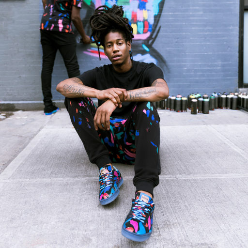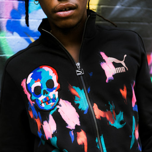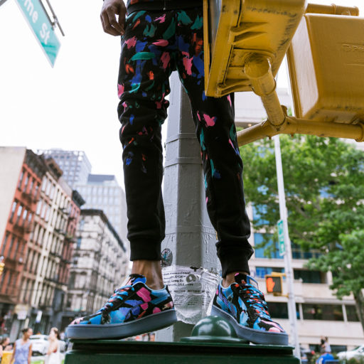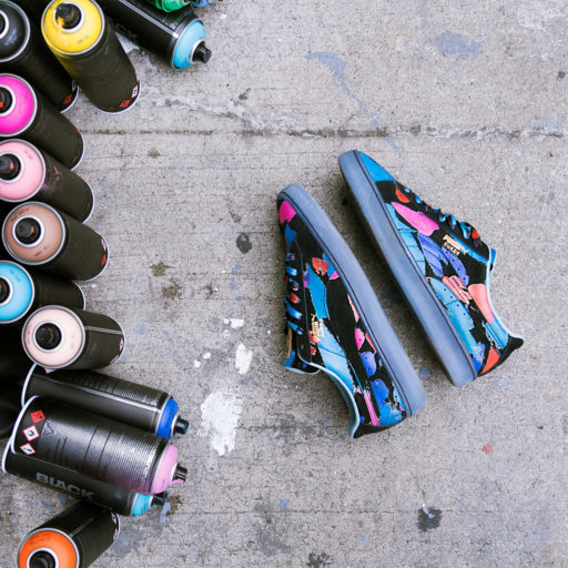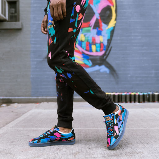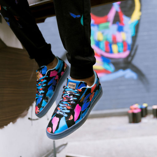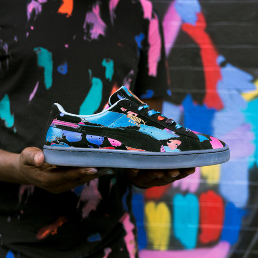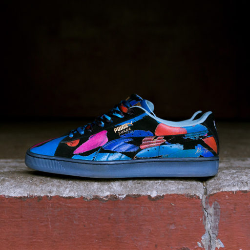 スウェードをキャンバスと考え、ブラッドリー・セオドアは鮮やかなブルー、ピンク、レッド、ブラックを使用してハンドタッチの手法でアッパーを豪華に仕上げています。