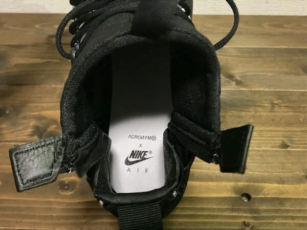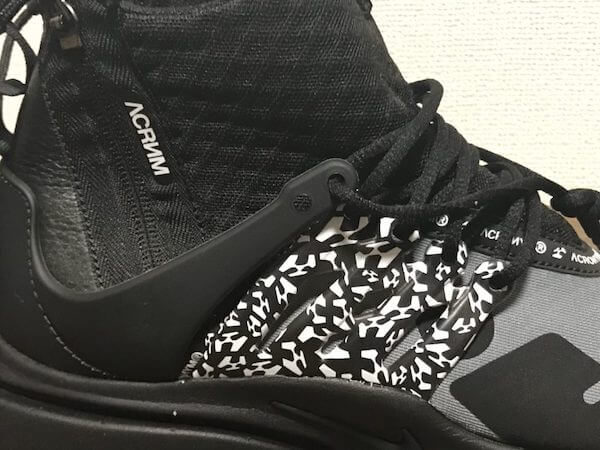アッパーの甲部分にナイキの”スウッシュ”と、ACRONYMの文字があります。