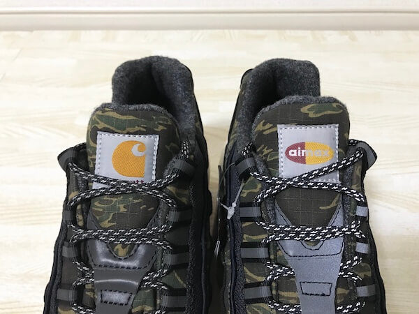 左足にはairmaxのロゴ、右足にはcarharttのロゴがあります。