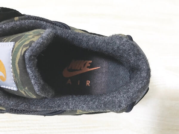 エア部分は鮮やかなオレンジで色付けされており、タイガーカモの少し濃いめ色合いにアクセントを与えています。