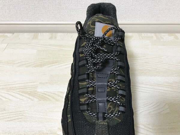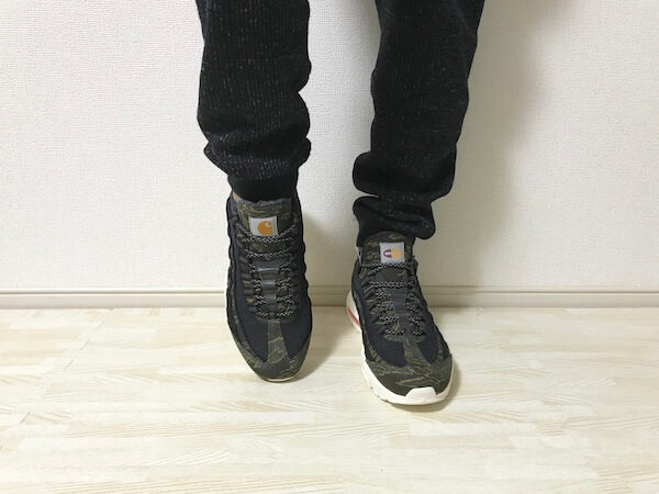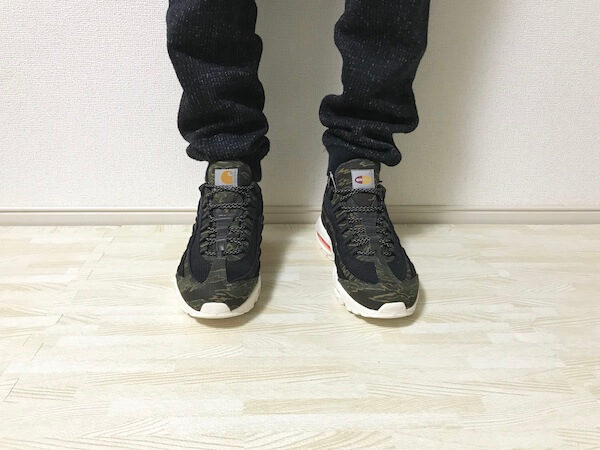 エアマックス95のボリューム感と、カーハートらしい柄、配色が相まって、”男らしい”いいゴツさが出ていてめちゃくちゃかっこいいです。