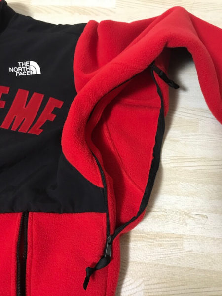 通常ノースフェイスのデナリジャケットは、左腕にノースフェイスのロゴがあるのですが、シュプリームコラボの場合、左腕にロゴがあります。
